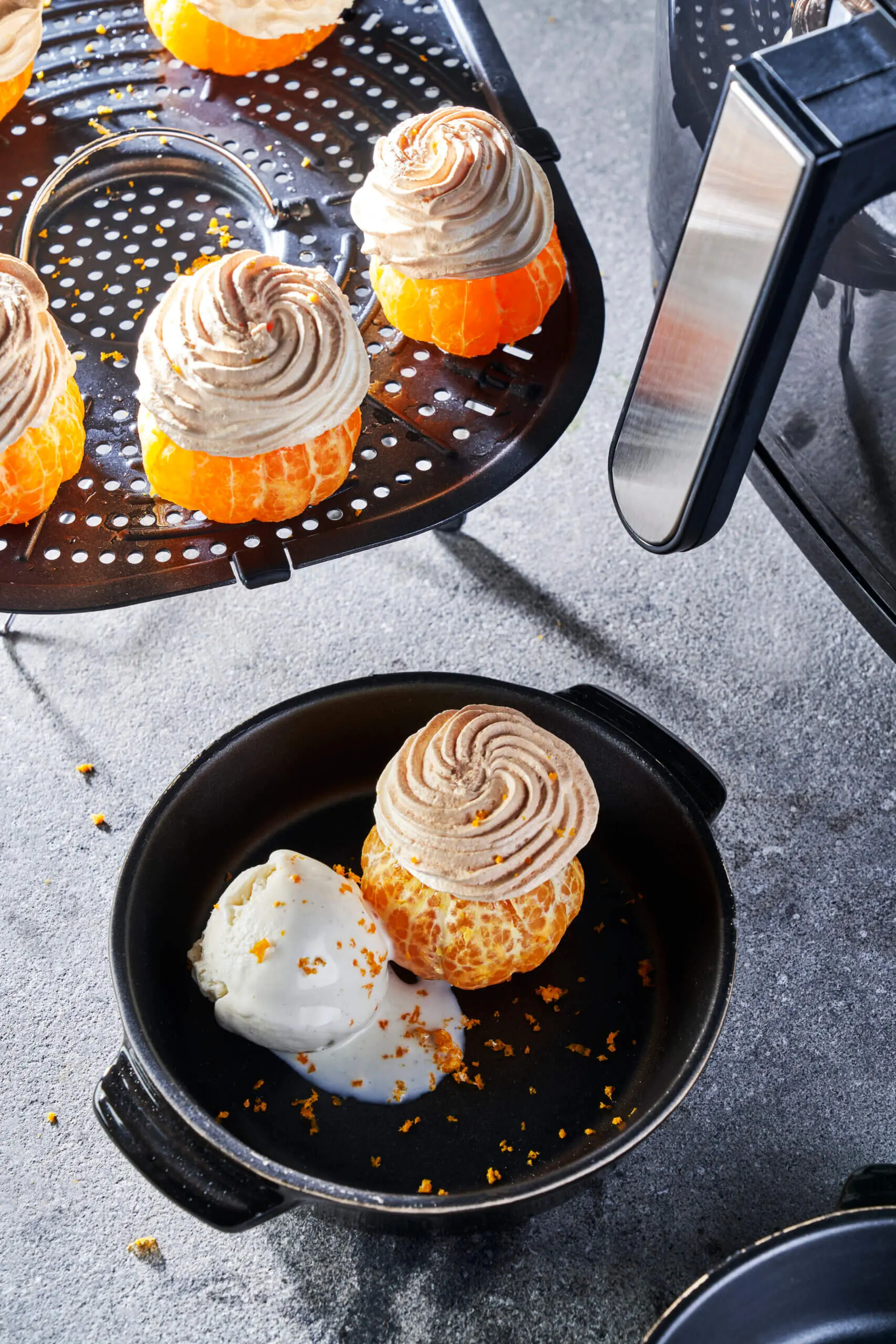 Poached tangerines with crispy fried egg white foam – Steam Aerofryer